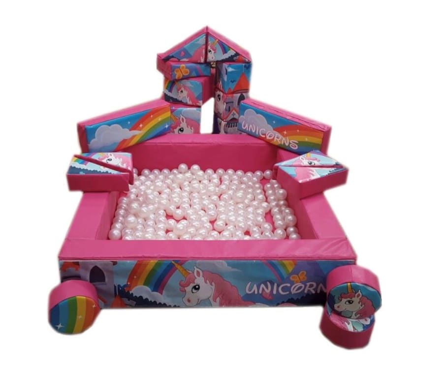 This lovely eye catching set features 17 unicorn designed soft play shapes, 2 large pink interlocking professional quality crash mats, a ball pond, 1 unicorn animal hopper, 1 seesaw, 1 pop up tunnel, and 1 scuttle bike.
